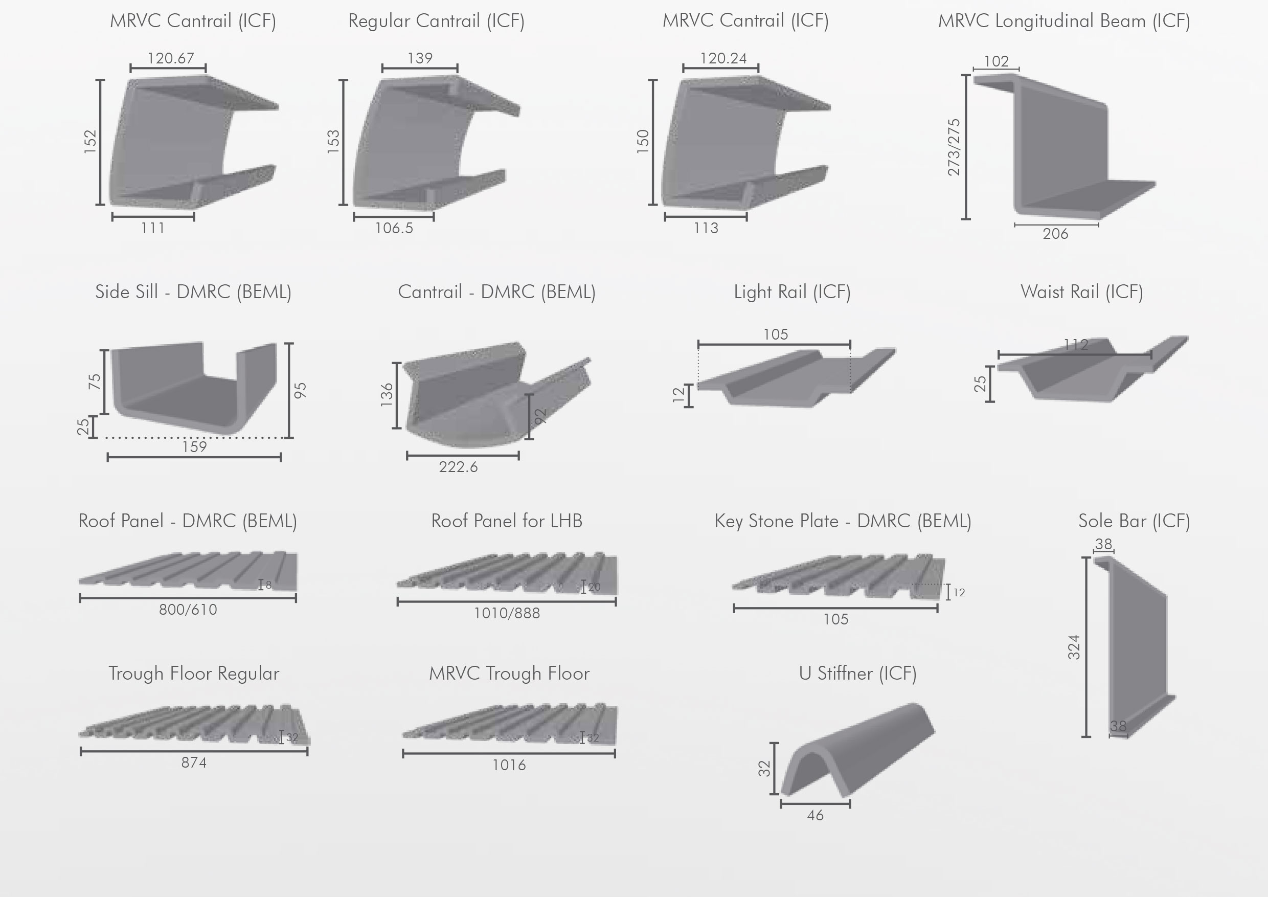 Various cold roll formed profiles used in rail coaches